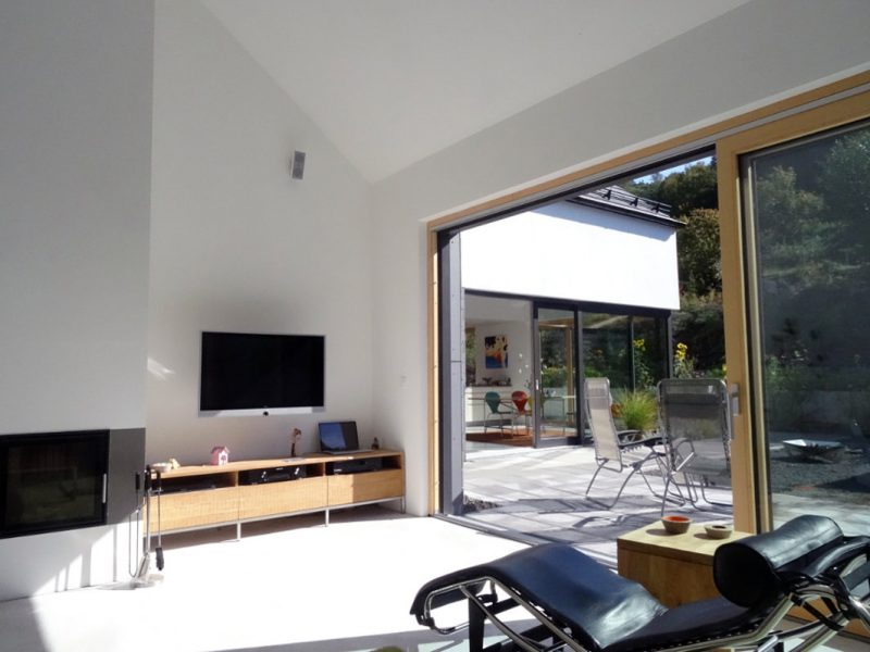Das Wohnhaus wirkt hier wie ein ebenerdiger Bungalow. Das Innere ist hell, praktisch und großzügig. Sichtbetonflächen zeigen die innere Tragstruktur und ein pflegeleichter, heller Sichtestrich verbindet die Flächen einheitlich.