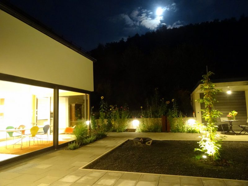 In Feudingen bildet das alte Wohngebäude mit eingebauter alter Mühle und landwirtschaftlichen Nebengebäuden eine Hofanlage. Dort hinein platziert sind zwei neue Baukörper, welche die Hofanlage stimmig ergänzen und für sich selbst wieder einen eigenen Hof formen.