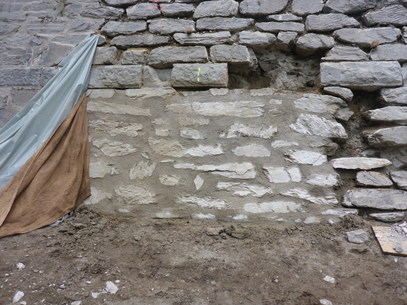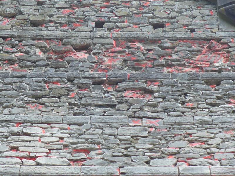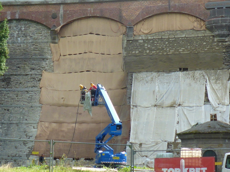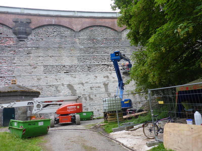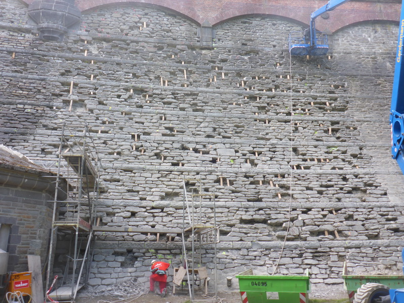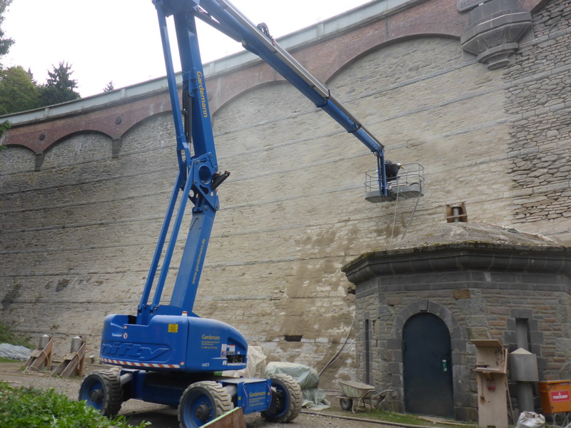 Nun ist die Mauerluftseite im Bereich der Talmitte instandgesetzt worden. Hierzu sind auf einer Fläche von ca. 600 m² die Fugen im Trockenspritzverfahren instandgesetzt worden und einzelne Steine ausgetauscht worden. Eine Besonderheit hierbei ist, dass die Arbeiten nicht mit einem Raumgerüst, sondern von Hubsteigern aus durchgeführt wurden. Der technische Vorteil hierbei ist, dass keine „Schattenbereiche“ hinter Gerüstlagen entstehen können, die erst nach dem Rückbau des Gerüstes nachgearbeitet werden könnten. Für die Instandsetzung relativ kleiner Teilflächen ist der Einsatz von Hubsteigern wirtschaftlich.